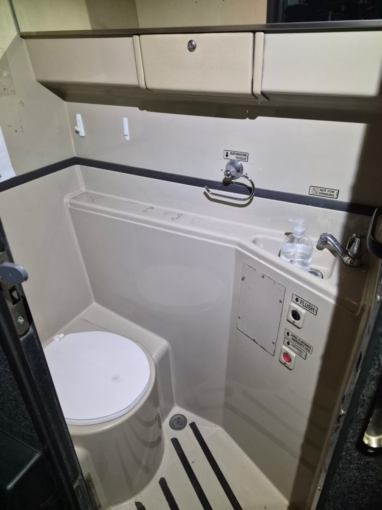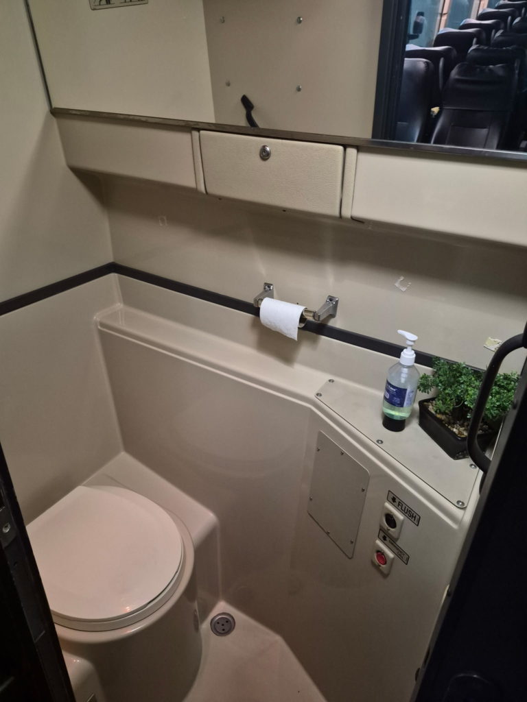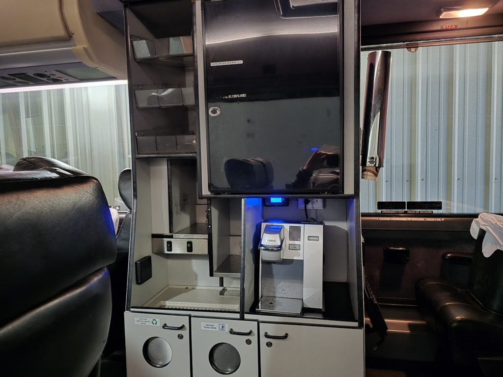 This bus is fully equipped to meet the needs of modern travelers, featuring complimentary onboard Wi-Fi, power outlets at every seat, and a convenient onboard washroom. A dedicated beverage station with fridge adds an extra level of comfort, keeping refreshments easily accessible throughout your journey.