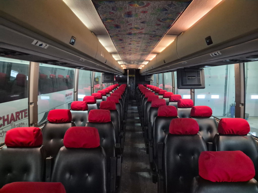 Make a statement on the road with “Big Red,” our full-capacity Prevost H3-45 designed to comfortably accommodate up to 56 passengers. This coach is a great fit for larger groups while still delivering the smooth ride and dependable performance Prevost is known for. At the rear of the bus, two built-in tables provide a practical and social space—perfect for team travel, group discussions, or simply enjoying the journey together.